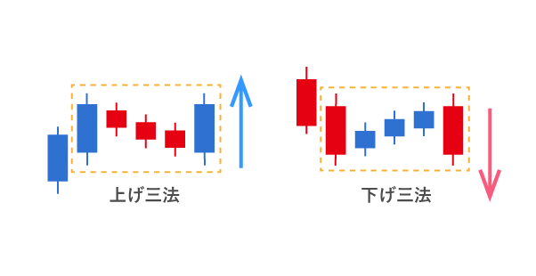 市場が「三法」の状態から上昇に転じた場合の買いエントリーを「上げ三法」と呼び、逆に下降に転じた場合の売りエントリーを「下げ三法」と呼びます。